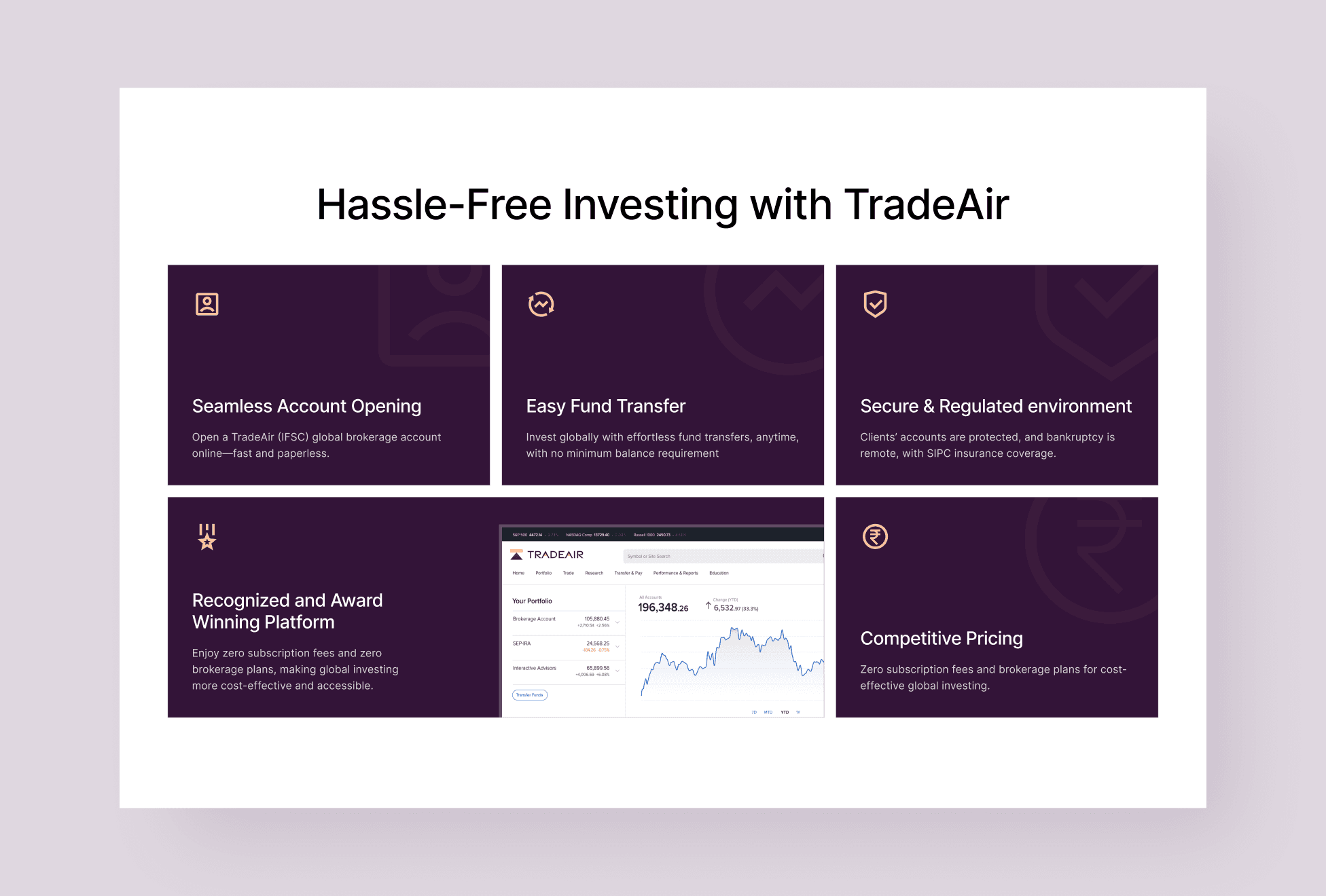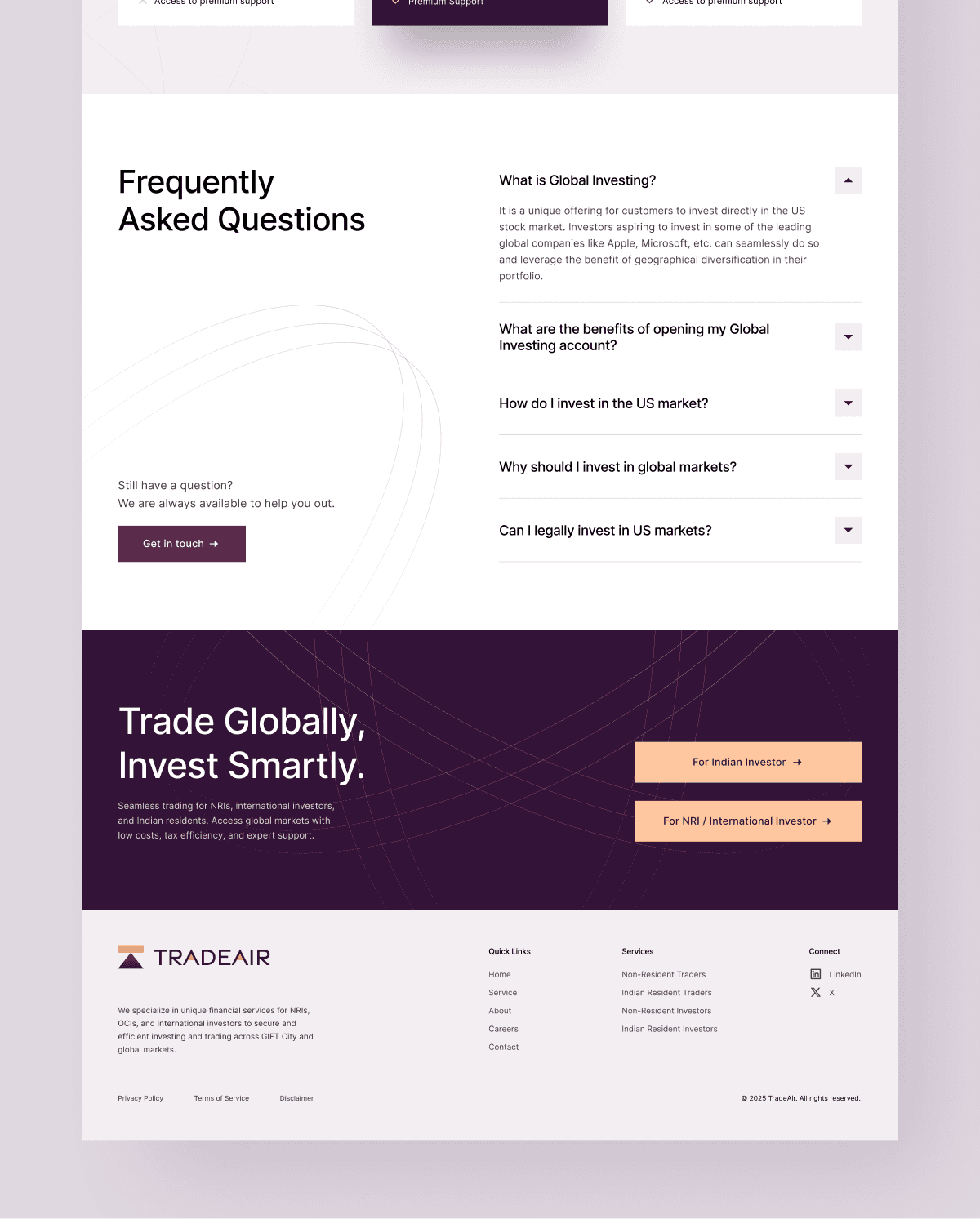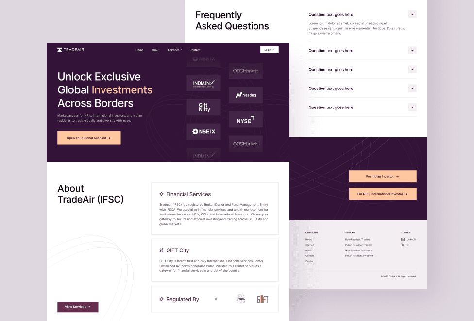 TradeAir’s marketing site was designed and built in Framer to make cross-border investing feel clear, credible, and easy to act on, especially for NRIs and international investors. Rich animations, smooth scroll, and polished transitions elevate the experience while keeping the content structured and scannable across key sections. The result is a higher-trust first impression and a frictionless path to inquiry, turning more visitors into qualified leads.